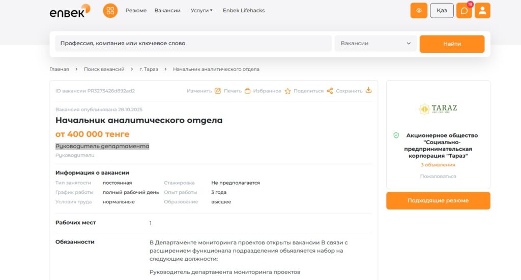 Контактное лицо:Главный специалист Департамента административно-хозяйственного обеспечения Уалибекова Акбота Сегизбайевна резюме присылать: на WhatsApp: 8 (707) 982 0024 на почту info@spk-taraz.kz